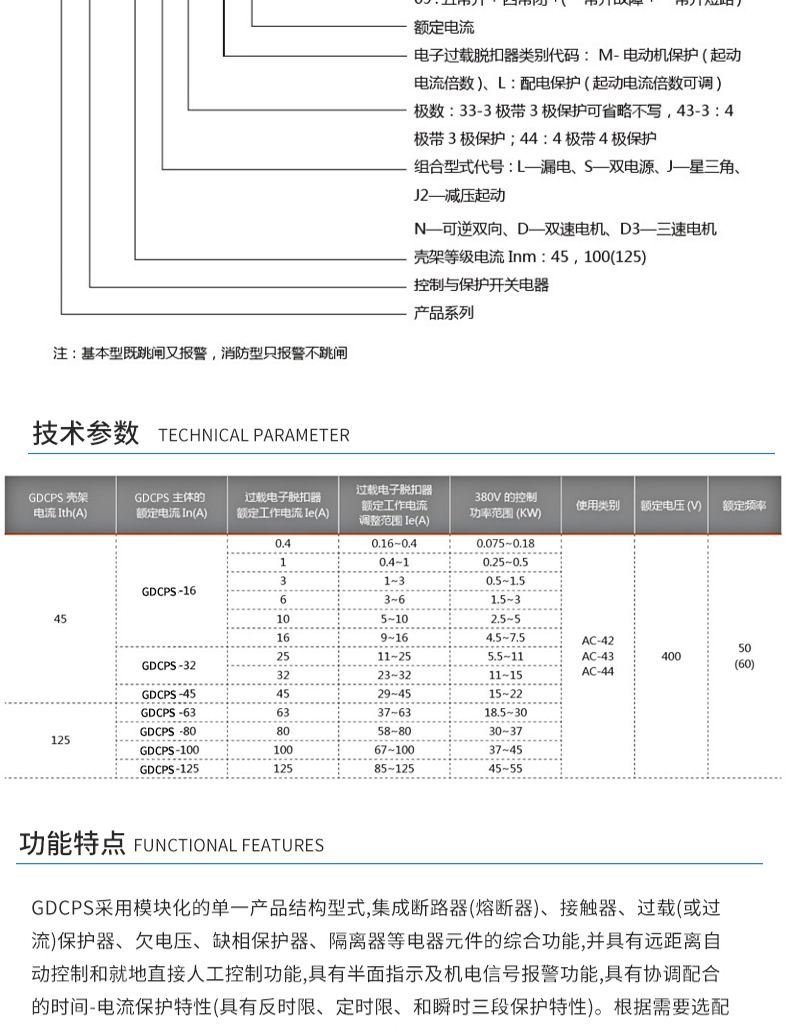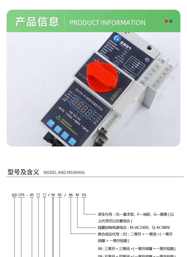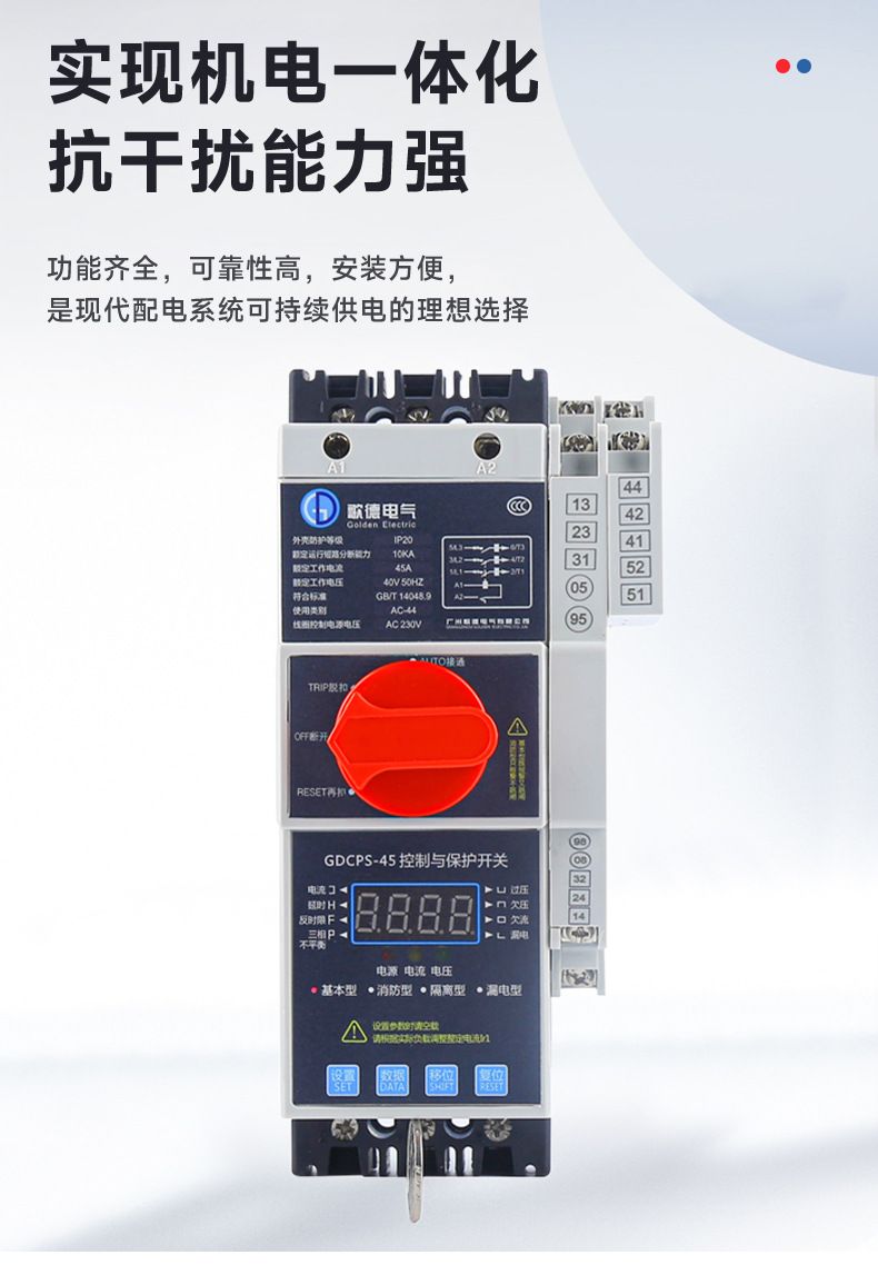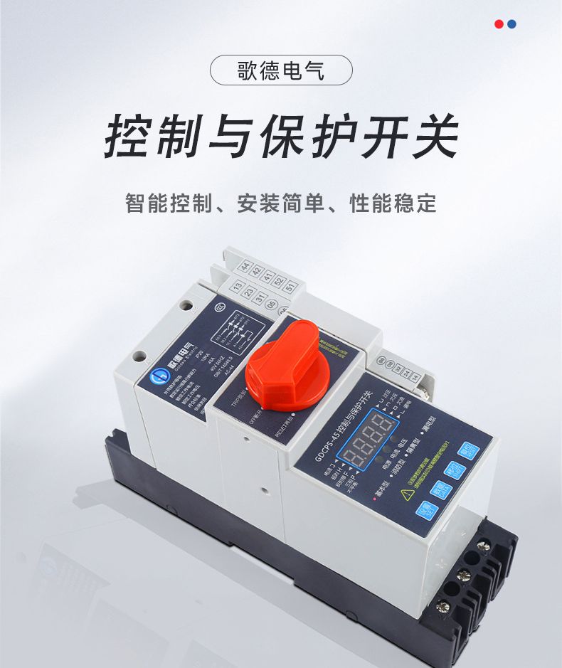 控制保护开关产品概述GDCPS-45控制与保护开关电器,它是低压电器中的新型产品。符合标准IEC60947-6-2《低压开关设备和控制设备第6部分-多功能电器第2节一控制与保护开关电器》控制保护开关一代产品体积比较大,保护采用的双金属片技术;第二代产品尽管解决了体积大的问题但保护技术没有什么大的突破:一直到上世纪九十年代中期,才出现了以微电子为保护技术的第三代产品。本公司研制开发的GDCPS系列控制保护开关就是以此技术为基础,并在此基础.上通过应用新的微电子技术,使控制保护开关技术得到了新的发展。