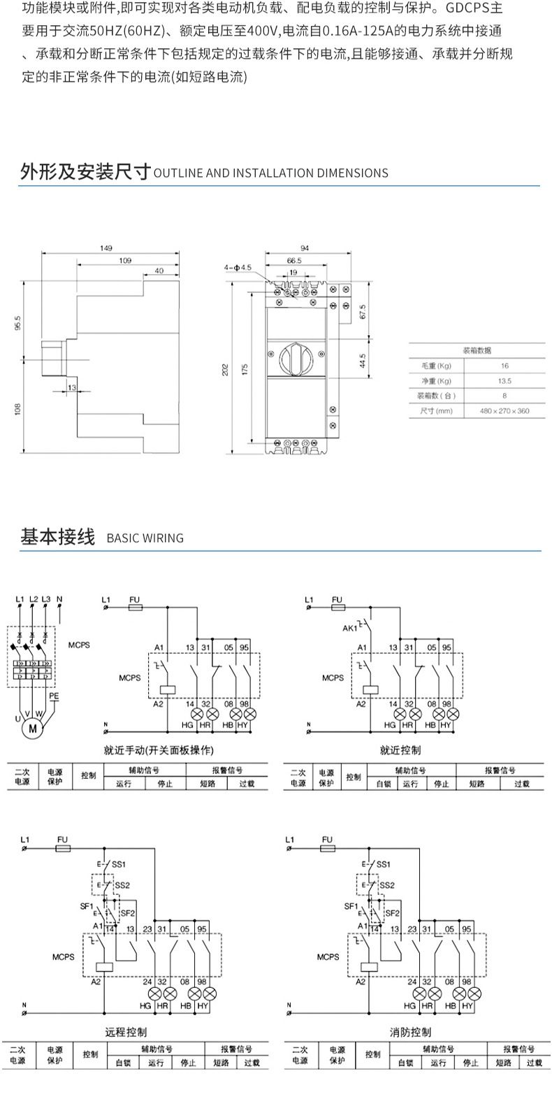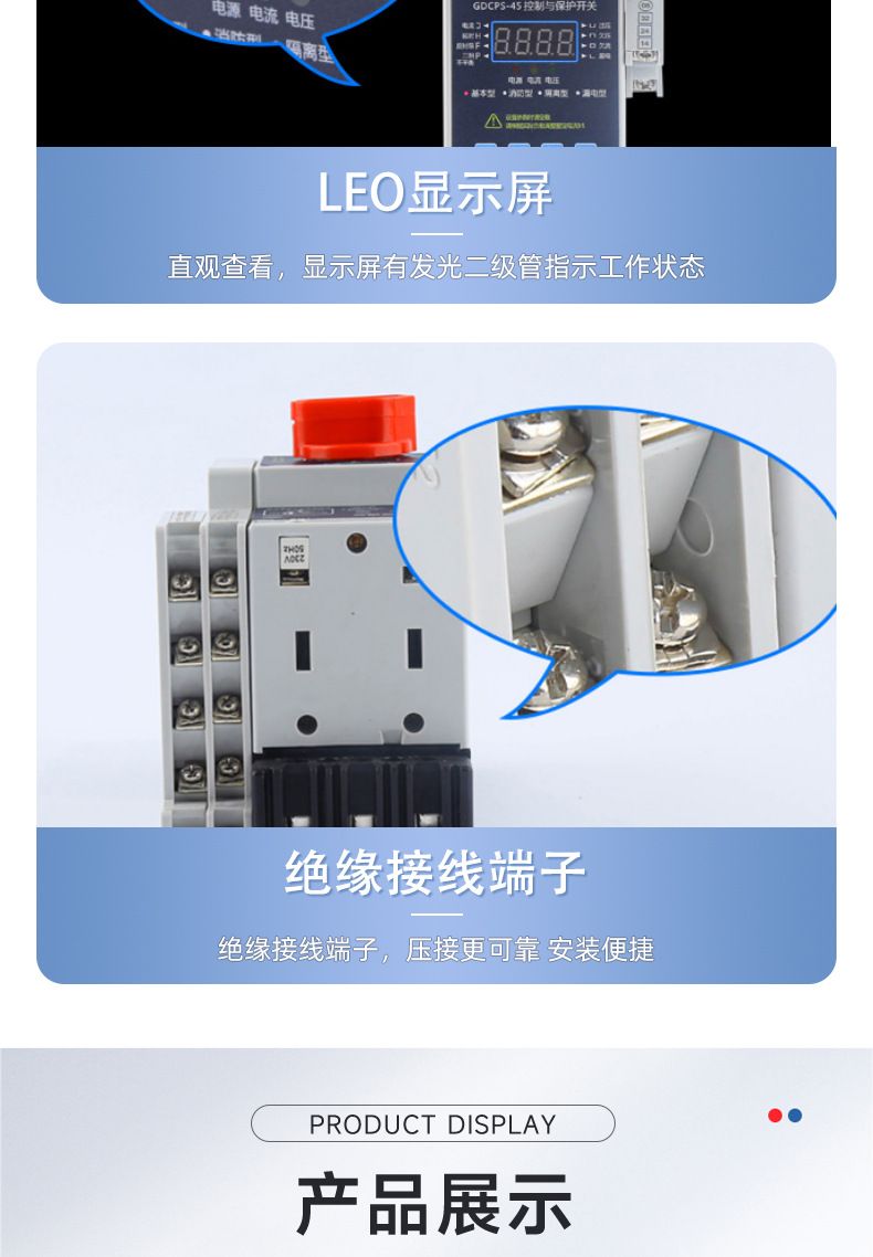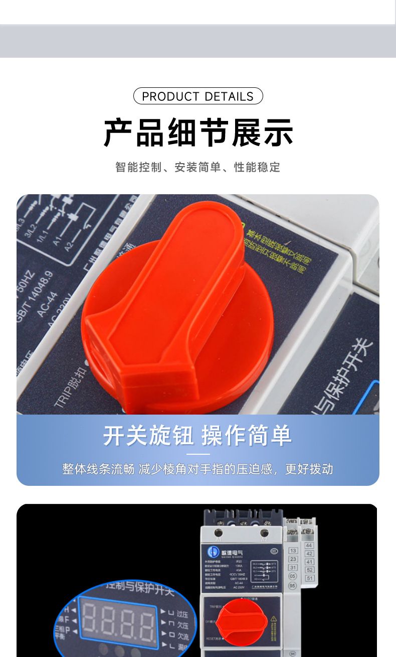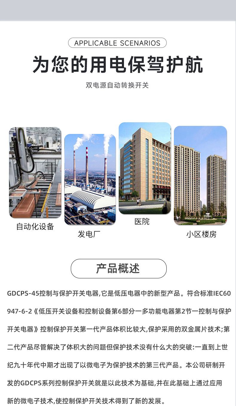 控制保护开关产品概述GDCPS-45控制与保护开关电器,它是低压电器中的新型产品。符合标准IEC60947-6-2《低压开关设备和控制设备第6部分-多功能电器第2节一控制与保护开关电器》控制保护开关一代产品体积比较大,保护采用的双金属片技术;第二代产品尽管解决了体积大的问题但保护技术没有什么大的突破:一直到上世纪九十年代中期,才出现了以微电子为保护技术的第三代产品。本公司研制开发的GDCPS系列控制保护开关就是以此技术为基础,并在此基础.上通过应用新的微电子技术,使控制保护开关技术得到了新的发展。