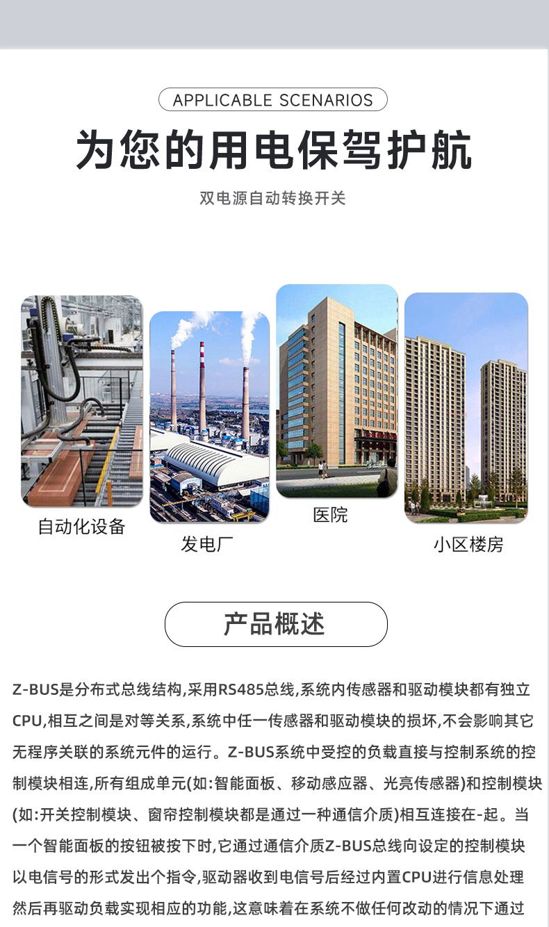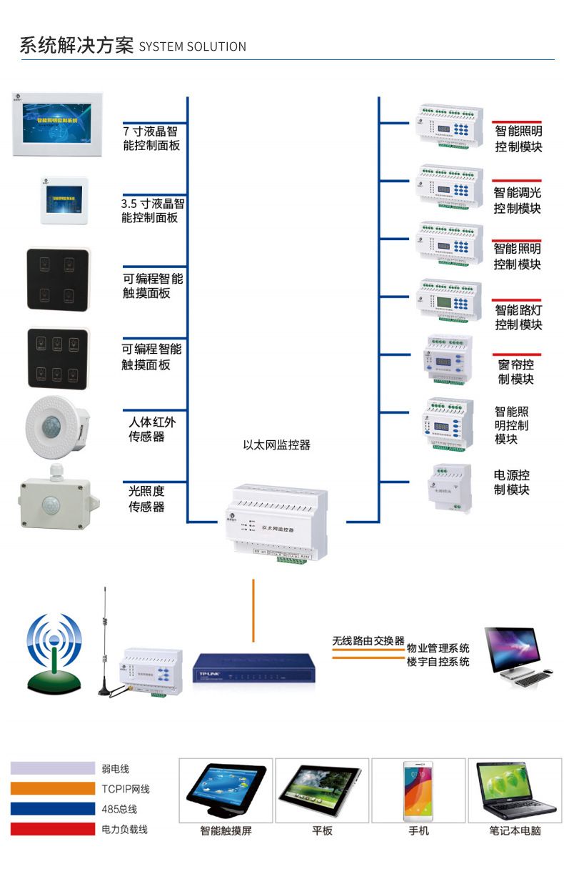 智能照明系统概述Z-Bus是分布式总线结构,采用RS485总线,系统内传感器和驱动模块都有独立CPU,相互之间是对等关系,系统中任一传感器和驱动模块的损坏,不会影响其它无程序关联的系统元件的运行。z- Bus系统中受控的负载直接与控制系统的控制模块相连,所有组成单元(如:智能面板、移动感应器、光亮传感器)和控制模块(如:开关控制模块、窗帘控制模块都是通过- -种通信质)相互连接在一起。当一个智能面板的按钮被按下时,它通过通信介质Z- Bus总线向设定的控制模块以电信号的形式发出个指令,驱动器收到电信号后经过内置CPU进行信息处理然后再驱动负载实现相应的功能,这意味着在系统不做任何改动的情况下通过编程实现功能的灵活多变。