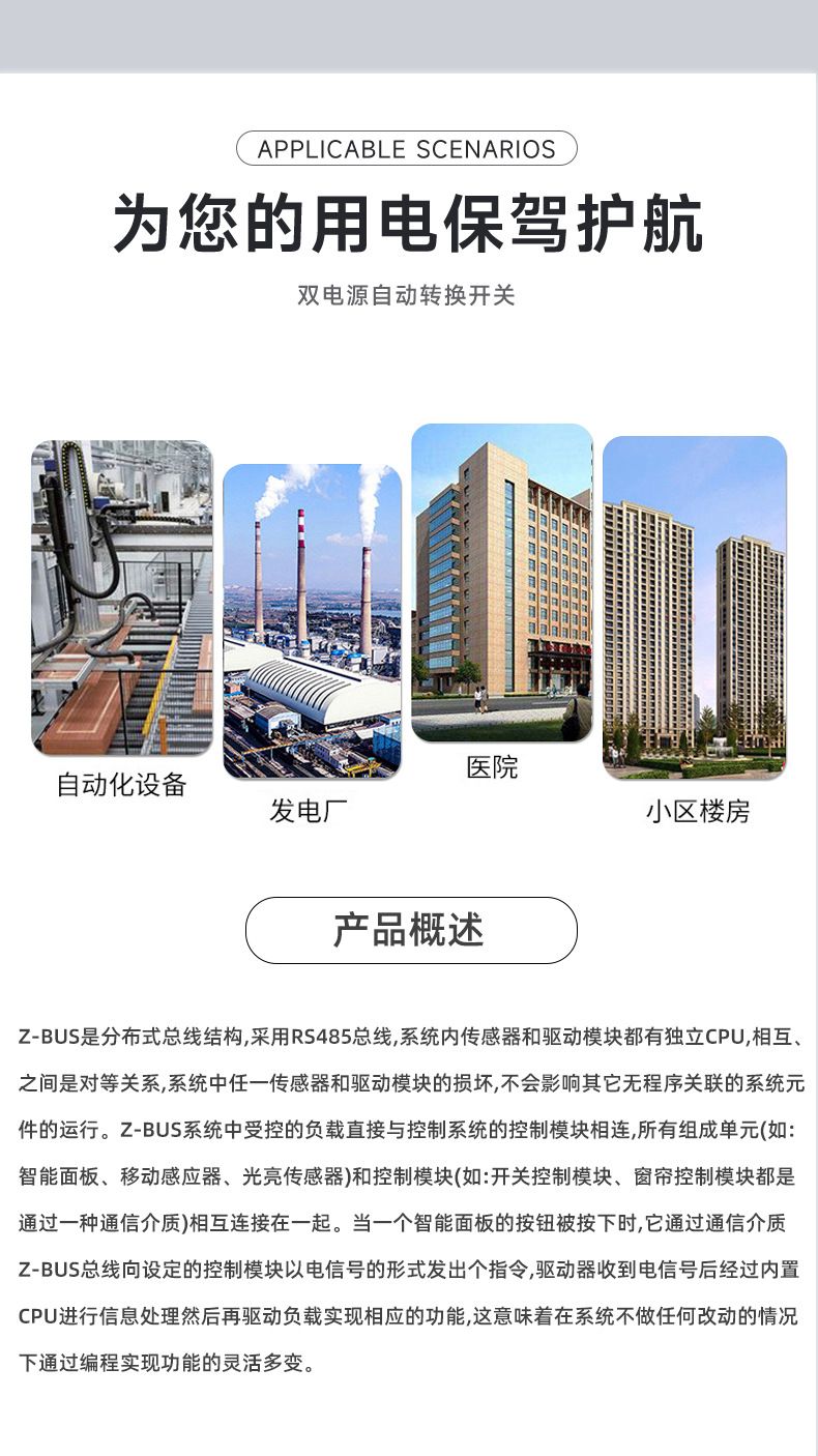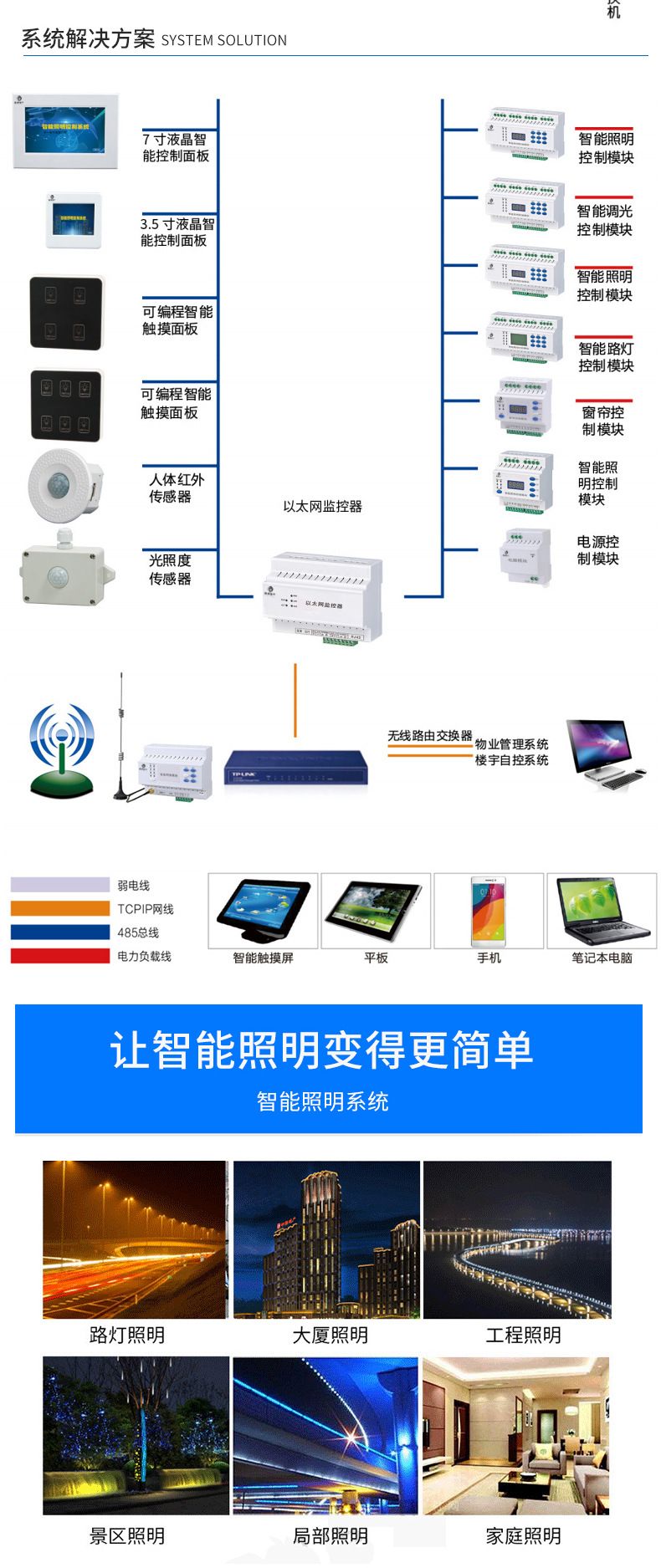 智能照明系统概述Z Bus是分布式总线结构,采用RS485总线,系统内传感器和驱动模块都有独立CPU,相互之间是对等关系,系统中任传感器和驱动模 块的损坏,不会影响其它无程序关联的系统元件的运行。Z- Bus系统中受控的负载直接与控制系统的控制模块相连,所有组成单元(如:智能面板、移动感应器、光亮传感器)和控制模块(如:开关控制模块、窗帘控制模块都是通过一种通信介质)相互连接在一起。当一个智能面板的按钮被按下时,它通过通信介质Z- Bus总线向设定的控制模块以电信号的形式发出个指令,驱动器收到电信号后经过内置CPU进行信息处理然后再驱动负载实现相应的功能这意味着在系统不做任何改动的情况下通过编程实现功能的灵活多变。