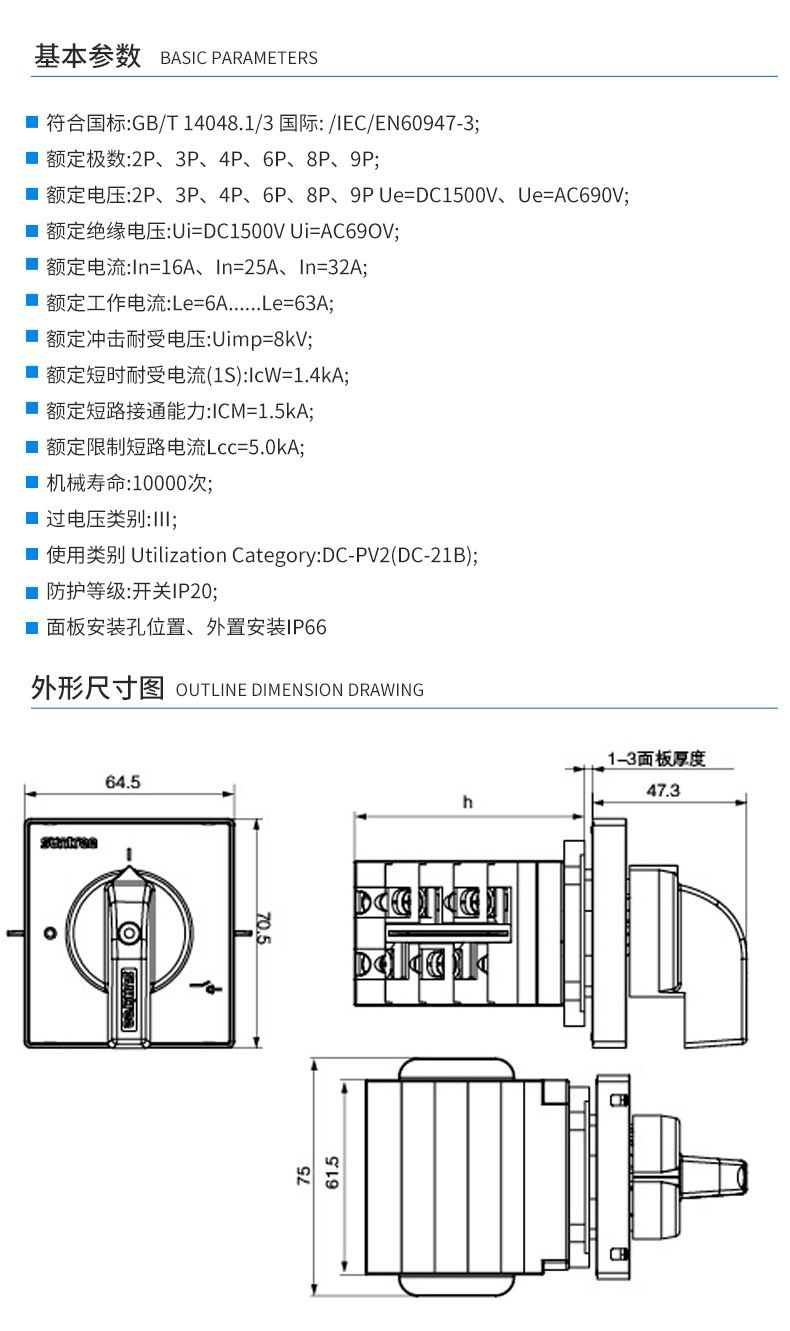 符合国标:GB/T 14048.1/3国际: /IEC/EN60947-3;