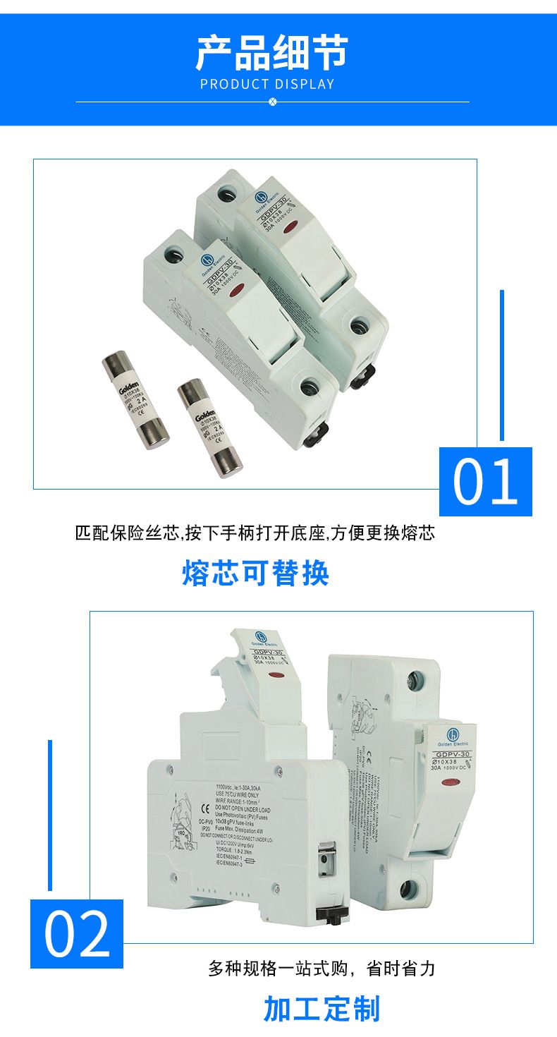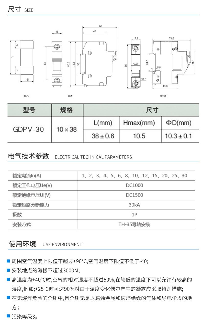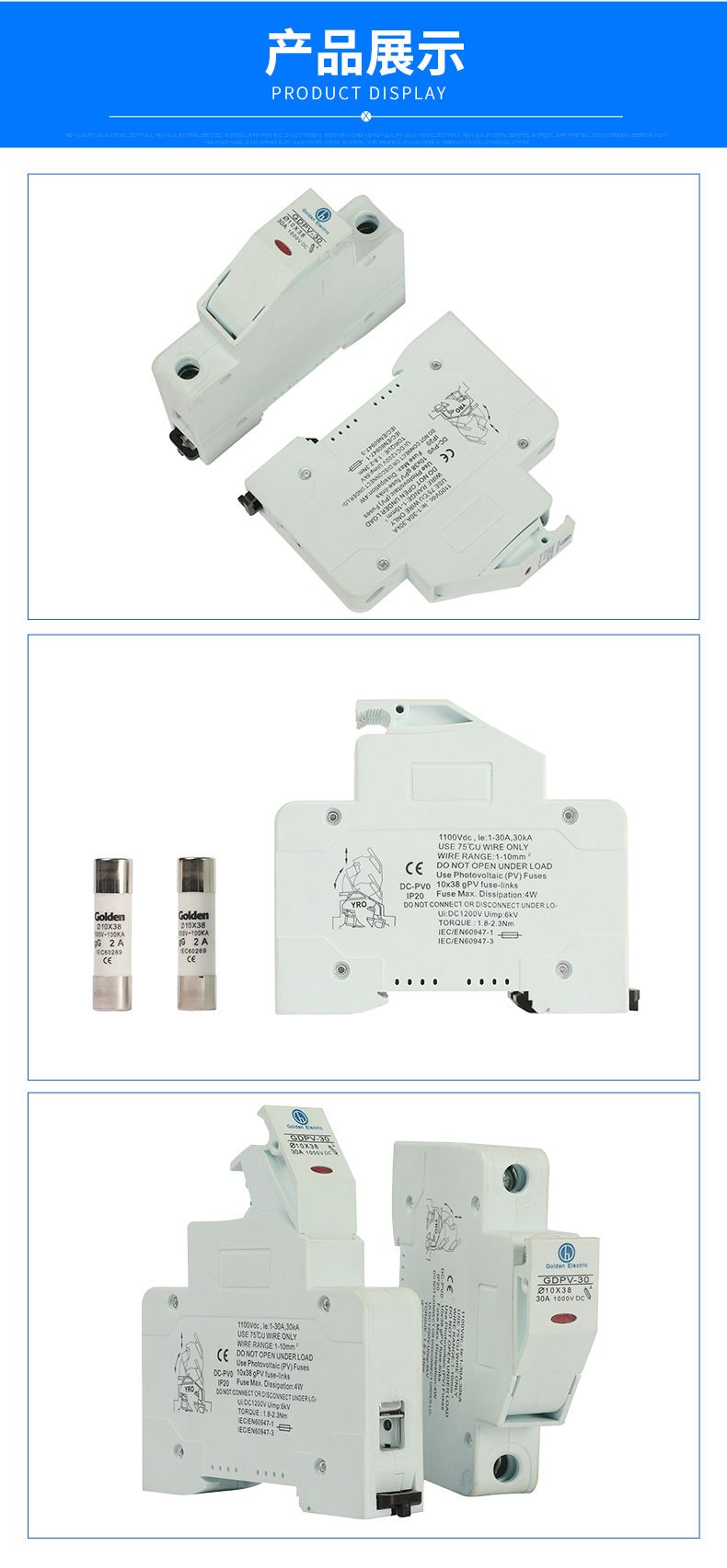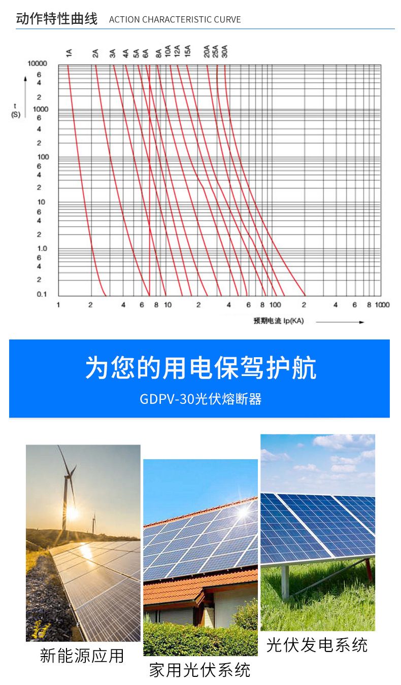 GDPV-30系列熔断器主要用于太阳能光伏发电直流汇流箱中,对可能产生的太阳能的电池板光伏组件及逆变器的电流反馈所产生的线路过载和短路电流进行分断,从而起到保护太阳能光伏组件板之用,熔断器也可选配在其它任何直流电路中作为对电器元件的线路过载和短路保护之用。