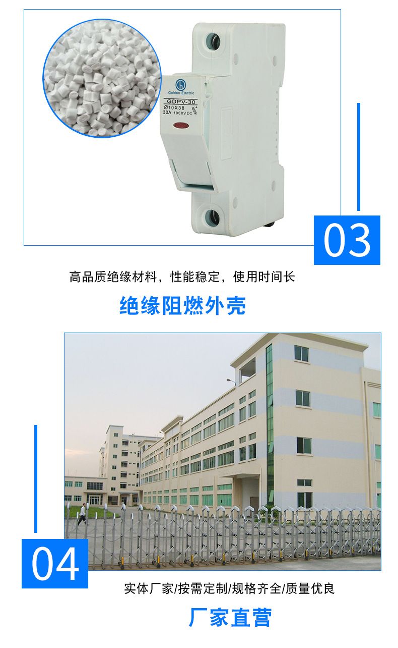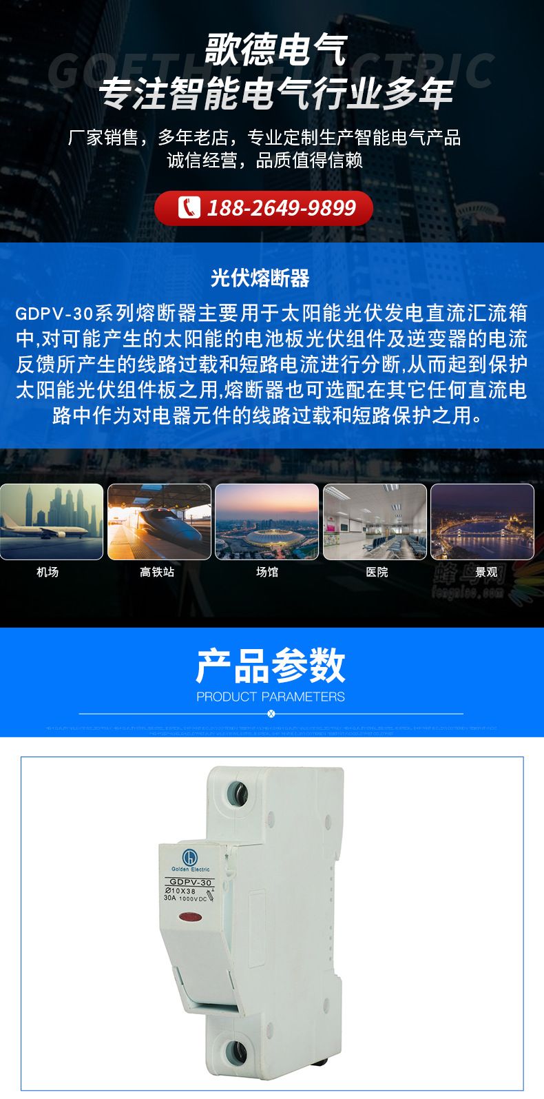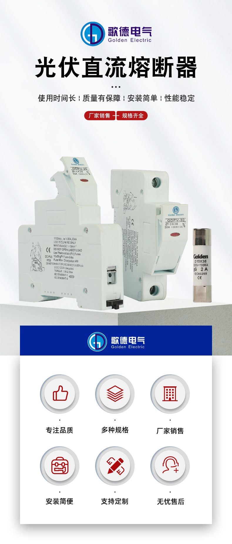 GDPV-30系列熔断器主要用于太阳能光伏发电直流汇流箱中,对可能产生的太阳能的电池板光伏组件及逆变器的电流反馈所产生的线路过载和短路电流进行分断,从而起到保护太阳能光伏组件板之用,熔断器也可选配在其它任何直流电路中作为对电器元件的线路过载和短路保护之用。